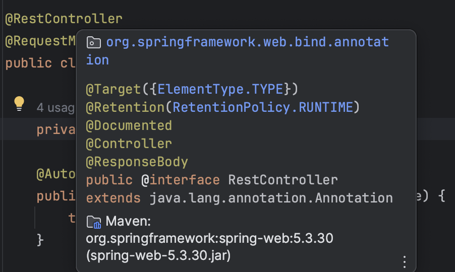 @RestController 내부에는 @Controller 와 @ResponseBody가 포함된 것을 알 수 있다.
